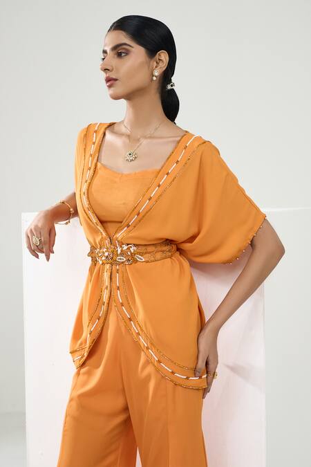 Yellow tunic featuring cape sleeves and a V-neckline with marigold bloom embroidery. Paired with a flared pant and an embroidered belt for a complete look.