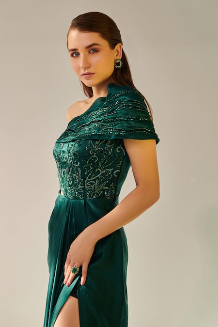Emerald green gown featuring an asymmetric one shoulder sleeve with cutdana, sequin, and bead embellishments