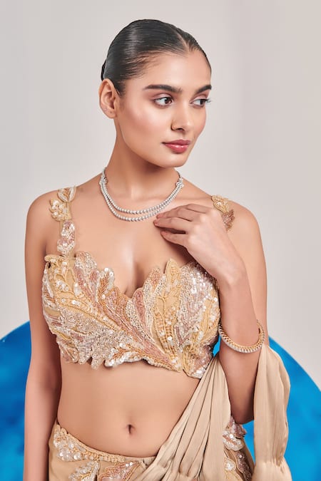 Champagne gold pre-draped saree featuring a pleated design with sequin embroidered floral appliques. Paired with a padded cut-out blouse adorned with cutdana embellishments.