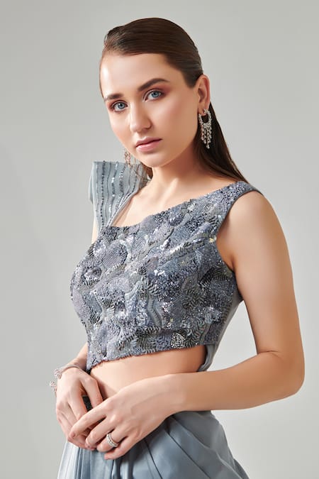 Grey saree gown featuring an asymmetric neck and sleeveless design