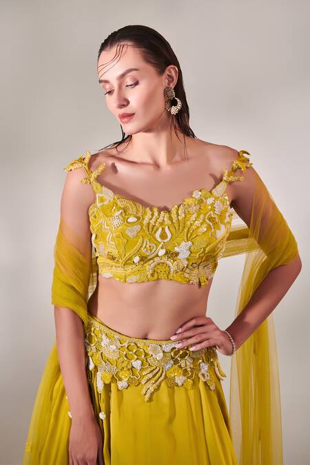 Yellow Crepe, Tulle, Satin Floral Abstract Embroidered Blouse Lehenga Set
