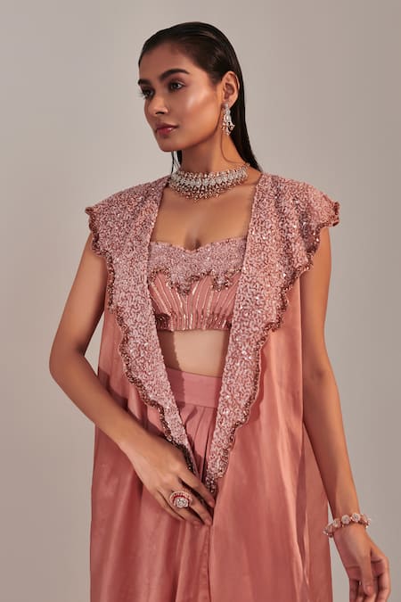 Pink Crepe, Silk Satin Sequins Sweetheart Wave Embroidered Cape Draped Skirt Set