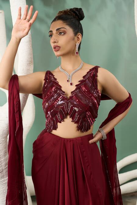Maroon Viscose, Organza, Chiffon Stardust Embroidered Top Draped Skirt Set