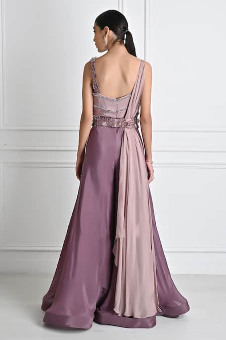 Mauve jumpsuit featuring pintuck detailing on the yoke and sequin, bead embroidery in a stripe pattern