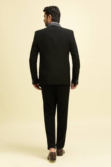 Black blazer featuring sequin wave bloom embroidery with shawl lapel collar. Paired with a full sleeves white shirt with pintucked details and matching trousers.