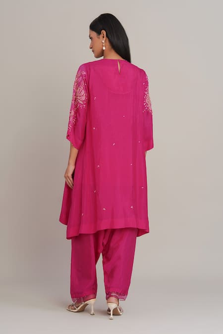 A hot pink kurta crafted from silk and organza, featuring floral applique highlighted with sequins, beads, and crystals. It is paired with satin pants and a cotton slip.