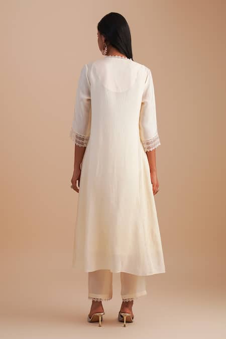White kurta featuring floral applique highlighted with sequins and beads. Paired with matching pants and a slip made from silk, organza, and crepe fabrics.