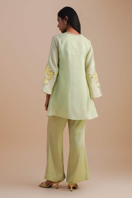 Green kurta featuring floral applique highlighted with sequins and beads. Paired with matching satin pants and a silk-cotton slip.
