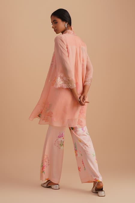 Pink kurta featuring floral applique highlighted with sequins and beads in the collar and cuffs. Paired with printed satin pants and a printed silk slip.