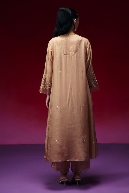 A gold silk kurta featuring floral applique highlighted with sequins, beads, and crystals. It is paired with coordinating silk pants and a cotton slip.