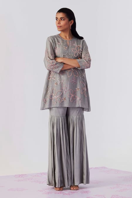 Grey kurta featuring floral motifs with sequin and bead embroidery. Paired with a matching sharara and a separate inner.