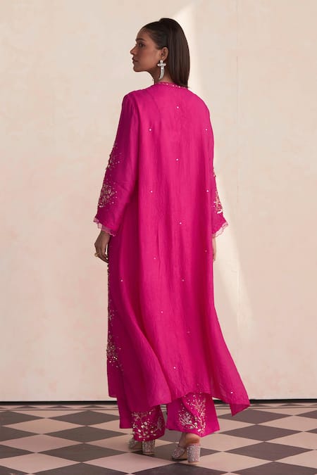 Hot pink silk kurta featuring floral, sequins, and beaded embroidery. Paired with satin pant and a cotton slip.