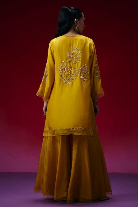 Yellow Silk Embroidery, Beads, Sequins, Floral Hand Kurta And Sharara Set