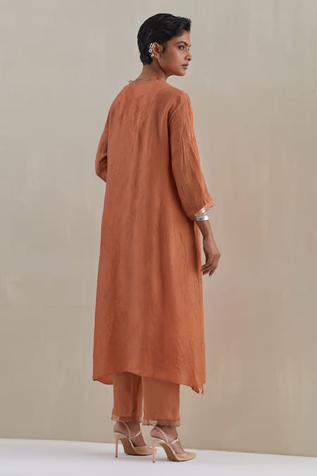 Orange Kurta Crushed Silk Hand Embroidered Floral V-neck Set