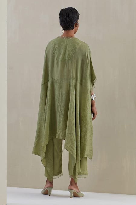 Green Kaftan Crushed Silk Hand Embroidered Flower V-neck And Pant Set