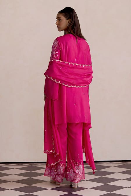 Hot pink tabby silk dupatta featuring scalloped edges with sequins and beaded embroidery