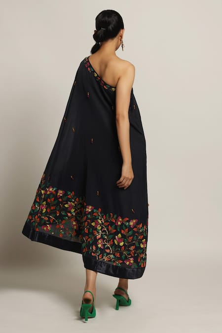 Dark blue one shoulder kaftan featuring floral cut pipe and bead embellishments