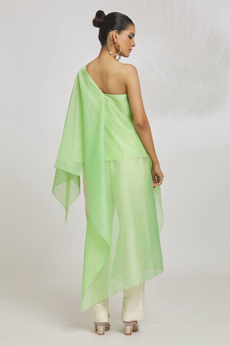 Green Organza Asymmetric One Shoulder Kaftan Top