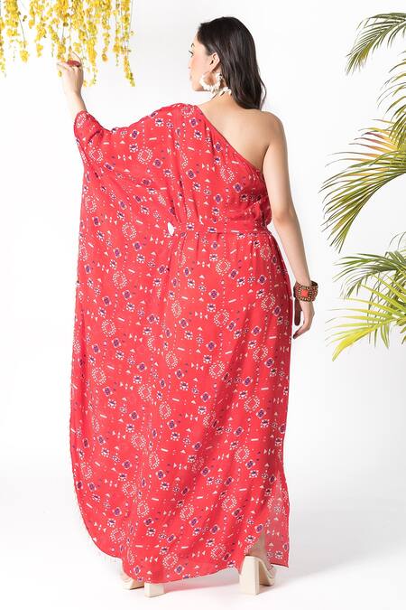 Red Crepe Tribal Print One Shoulder Kaftan With Belt