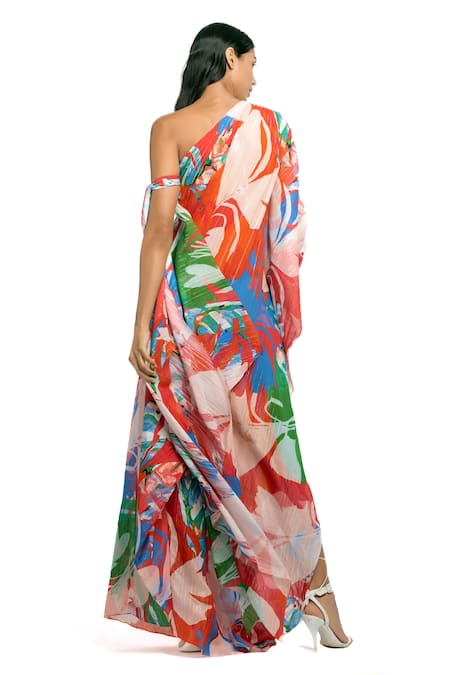 Red & beige one shoulder kaftan in cotton lurex base with abstract printed motifs with arm tie-up.
