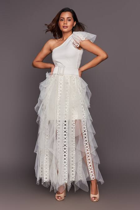 Buy_Deepika Arora_White One Shoulder Ruffle Gown_Online_at_Aza_Fashions