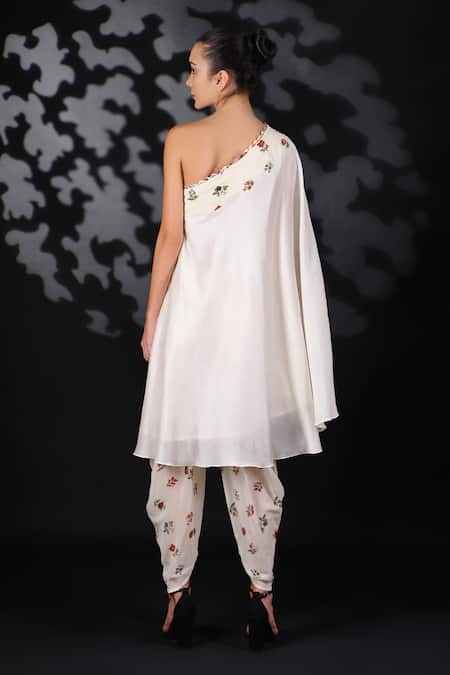 Off white handwoven cotton jamdani one shoulder tunic with scallop details & floral motifs on the neckline. Paired with hand-painted chintz print dhoti pant.