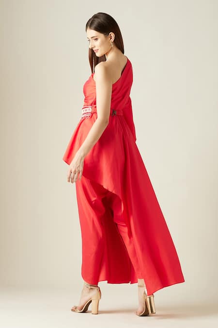 Red silk tissue one shoulder draped tunic. Comes with draped pant & embellished belt.