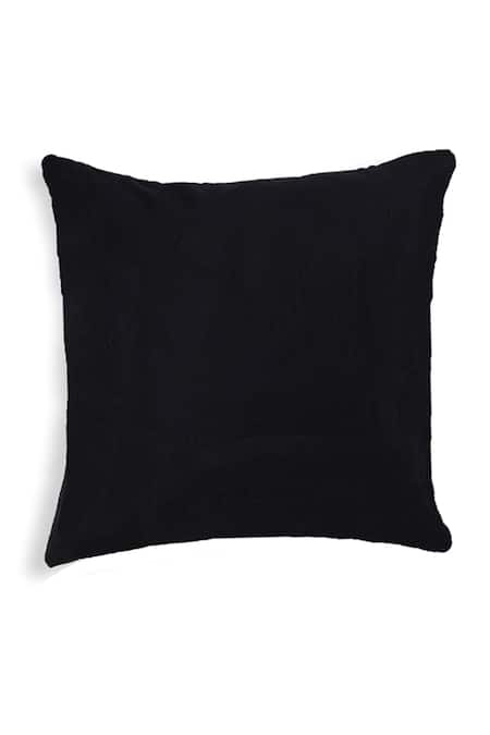 Black square shaped cushion cover with bead embroidery in floral pattern.