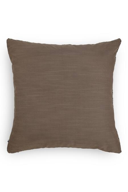 Neutral rectangle shaped set of 2 cushion cover with Nagari cityscape print & kantha stitchline thread embroidery.