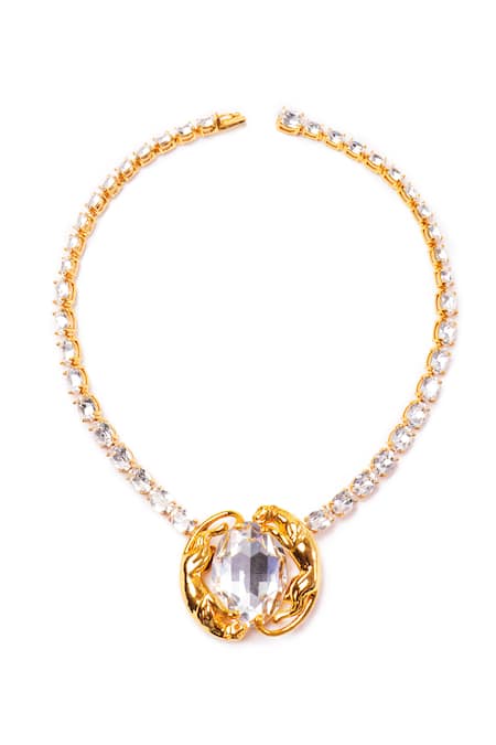 Gold necklace featuring a carved panther pattern central pendant, adorned with Swarovski stones