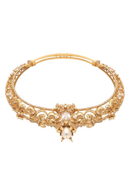 22k matte gold choker featuring intricate elephant motif embellished with crystals and baroque pearls