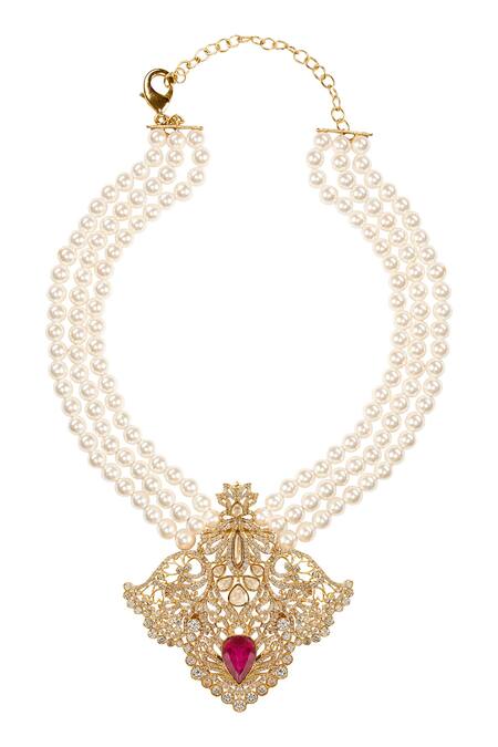 22k gold plated pendant necklace featuring floral cutwork design with Swarovski, pearl, and crystal embellishments