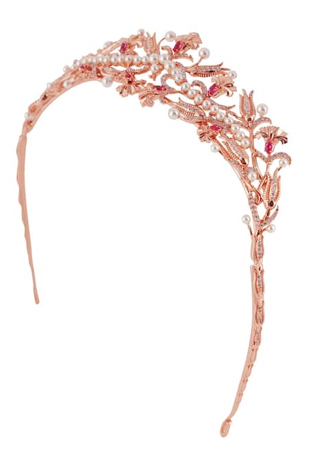 Gold hairband featuring 3D Persian tulip motifs with encrusted stones and embellished pearls