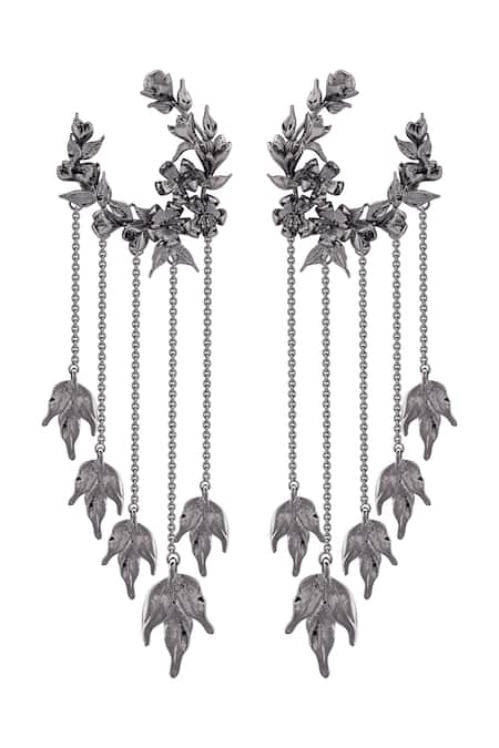Gunmetal finish long earrings featuring a 3D floral motif hoop with multi-chain danglings