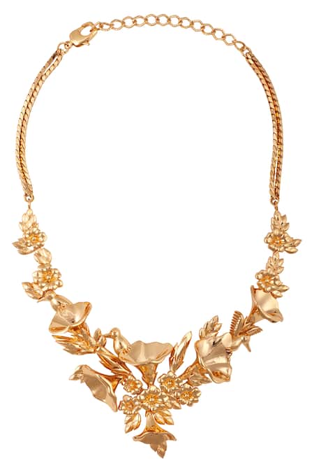 Gold collar necklace featuring 3D floral and bird motifs with carved details
