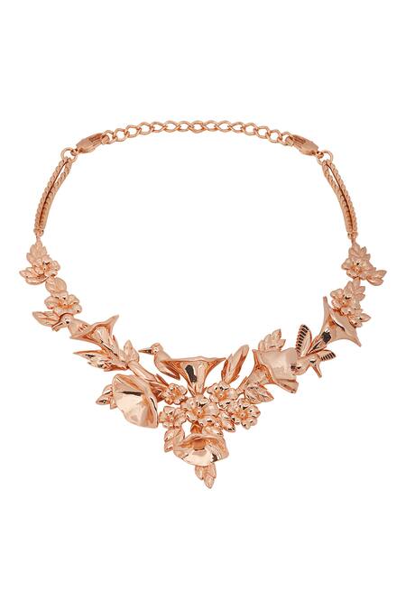 Gold collar necklace featuring 3D floral and bird motifs with carved detail