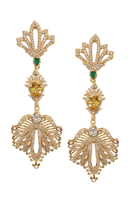 Contemporary 22k gold plated earrings featuring intricate designs embellished with crystals, emeralds, and citrine stones