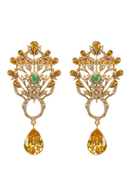 White dangler earrings featuring emeralds, crystals, and citrine stone embellishments