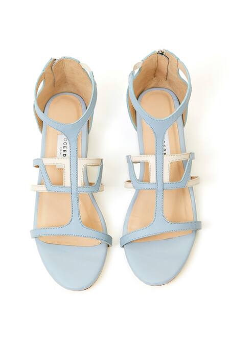 Powder blue, ivory open toe block heel with strappy, cutwork & back zipper detailing.