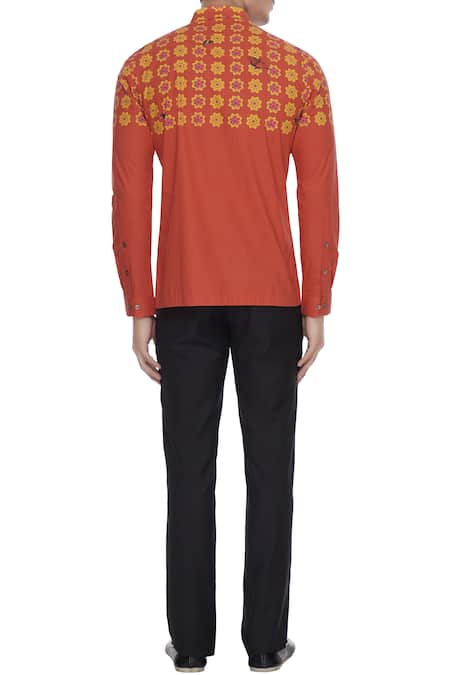 Shop_MR. Ajay Kumar_Orange Butterfly Floral Engineered Print Collar Shirt_Online_at_Aza_Fashions
