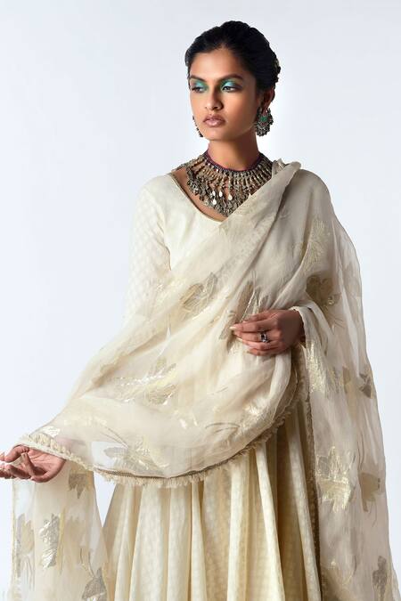 Ivory anarkali with all over hand embroidered motifs and zari trim detail on neckline. Comes with dupatta.