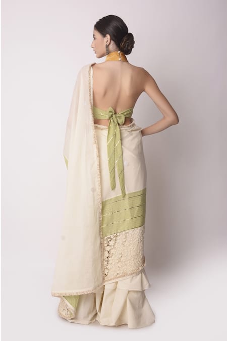 Ivory pre-draped saree with jade panel, gota patti trims and floral lace detail. Comes with halter blouse.
