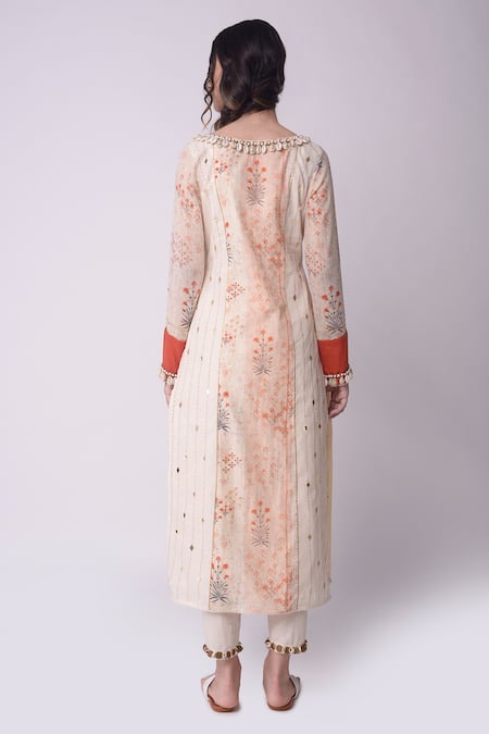 Ivory & orange kurta with kantha, mirror work embroidery, floral printed motifs & embellished yoke. Paired with cropped pant with embellished hem. Comes with floral printed dupatta.