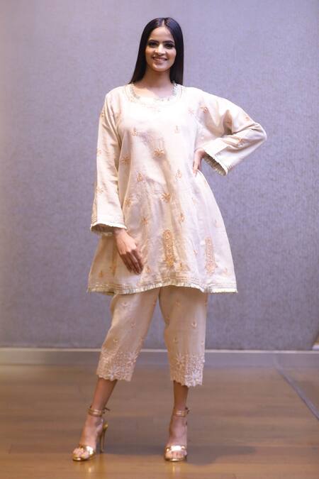 Peach flared kurta with floral hand embroidered motifs. Paired with cropped embroidered pant.