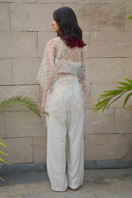 Off-white sheer checkered kaftan style top in hand embroidered detail.