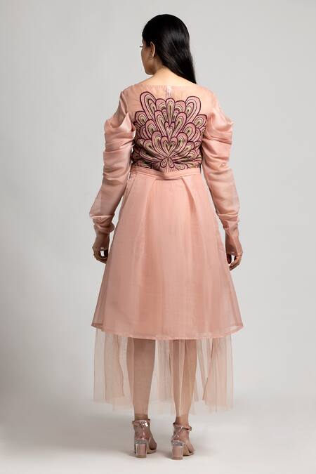 Peach Organza And Nylon Net Embroidery Thread Boat Dress