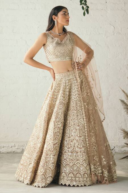 Buy_Studio Iris India_Beige Organza V Neck Embroidered Bridal Lehenga Set_at_Aza_Fashions