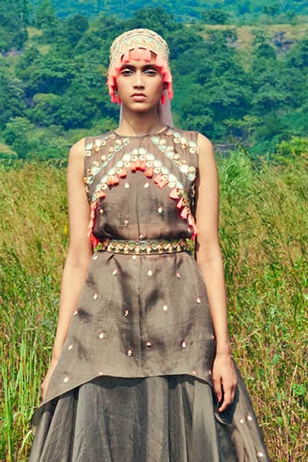 Olive green cape style asymmetric with mirror, sequin & cutdana embroidered motifs & tassel detail. Paired with lehenga, bustier & embroidered belt.