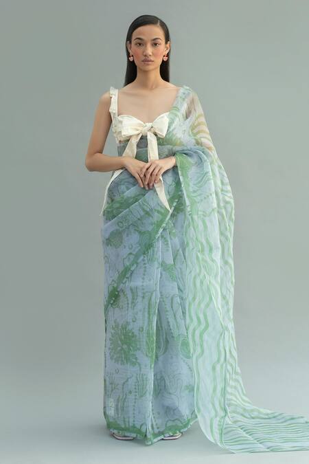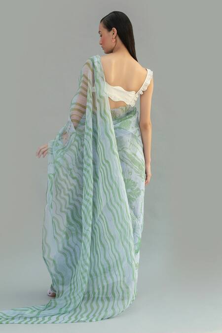 Blue organza saree with all-over green wavy-floral print.