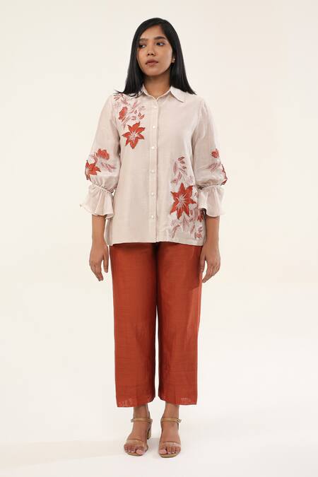 Off white shirt with rust orange blossom applique and resham thread embroidery. Paired with rust orange pants for a coordinated look.